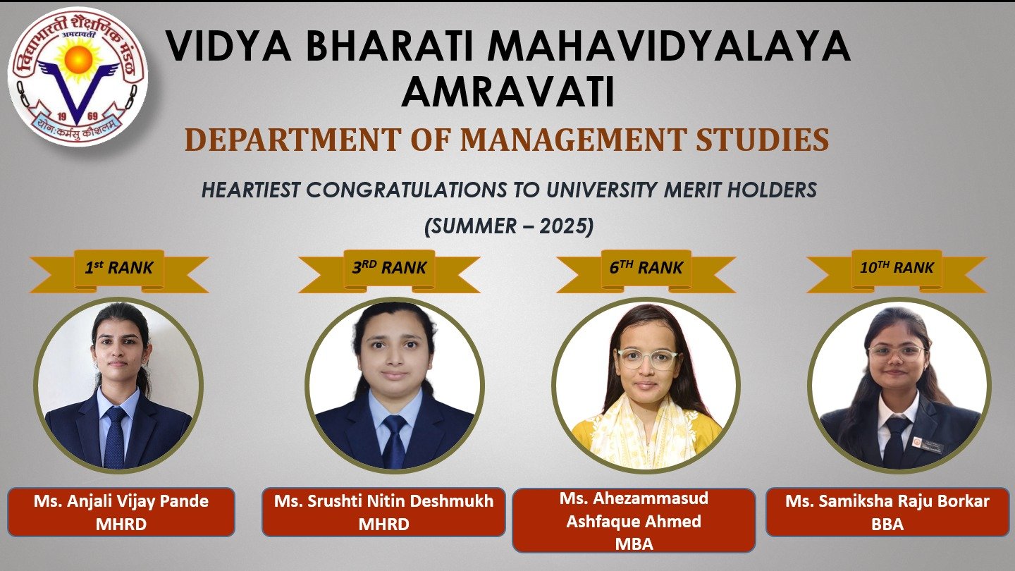 Department of Management Studies is one among the oldest colleges of MBA in the region, under Vidya Bharati Shaikshanik Mandal, Amravati which started with the intake capacity of 30 students grown to intake capacity of 60. Established brand of MBA pulls the students from all over the region and from different segments of the society. The huge multistoried building equipped with physical infrastructure built as per the norms of AICTE, New Delhi is the star attraction. Conducive environment for teaching-learning, best university results, curricular and extracurricular activities, placements are the most attractive features of the department. Above all the creative and innovative human resource is the key to the success of department. The Department of Management offers total of four courses i.e. Three PG courses MBA, MHRD, MCM which were established in the year 1995, 1995 and 2000 respectively while the under graduate course BBA was introduced in the year 2000. The pattern of these courses is Semester wise. To improve upon the student personality and imbibe the socially responsible culture and value, special student forum is created for this and named as AMS (Association of Management Students) and GEMS (General Events & Management Society). Many functions such as celebration of Introduction programme to newly entered students, farewell function to the senior students, arranging of Guest lectures, Seminars, Speeches, Presentation competition, Industrial visits to many organizations, Tours, Teacher’s Day celebration, Workshops on Synopsis Writing etc. are organized by the Management Society. Thus, Management Department keeps in mind the social responsibility of education institute during admission, by satisfying each and every segment of society and focuses towards Output based education by giving students an overall learning experience.
